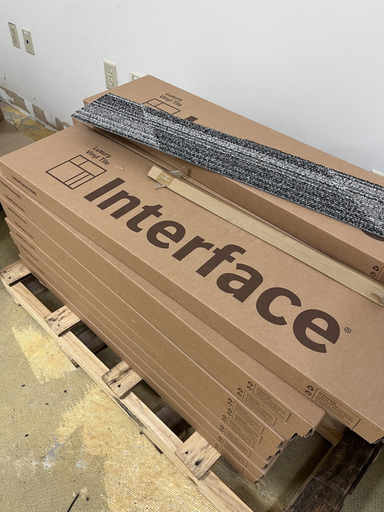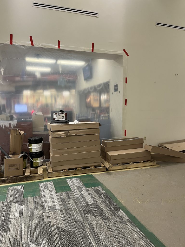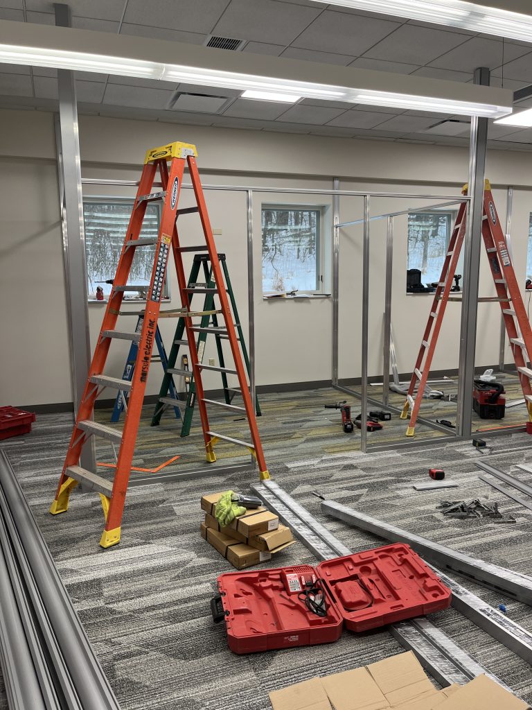 In recent weeks, major interior updates have been taking shape. New carpeting has been installed in the renovation area, and patrons may notice new wood laminate/LVT flooring near the circulation desk as part of the flooring improvements. Recent work has also included the construction of the metal frames for the quiet study rooms.